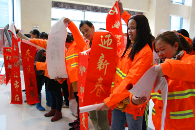 “春滿人間百花吐艷 福臨小院四季常安” “一帆風(fēng)順年年好 萬(wàn)事如意步步高” ……1月26日至28日,麗匯大廈一樓熱鬧非凡,為了感激社會(huì)各界對(duì)綠港集團(tuán)的關(guān)心與支持,由綠港集團(tuán)工會(huì)組織的書法家“迎新春 送祝?!绷x務(wù)送春聯(lián)活動(dòng)吸引了大量前來(lái)求墨寶的社會(huì)各界人士。三位南寧市書法協(xié)會(huì)的書法家以及南寧科巨公司副總經(jīng)理陸章發(fā)為觀眾們現(xiàn)場(chǎng)揮毫,一幅幅金燙燙、散發(fā)著墨香的春聯(lián)映襯著人們的笑臉,整個(gè)現(xiàn)場(chǎng)彌漫著濃濃的年味,短短三天時(shí)間便送出了2000多副春聯(lián)。1月26日上午,綠港集團(tuán)工會(huì)還啟動(dòng)了派送春聯(lián)儀式,綠港集團(tuán)工會(huì)主席黃麗琴帶領(lǐng)工會(huì)人員將春聯(lián)送到經(jīng)開(kāi)區(qū)40余位保潔人員、園林綠化工人、公司職工的手上。(張彩秀/文、圖)
