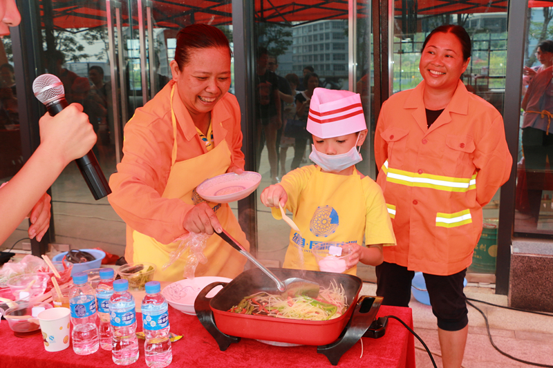 搶答活動(dòng)結(jié)束之后,進(jìn)入“小廚神”廚藝大比拼環(huán)節(jié)。由園林綠化工人、水電維修物業(yè)工人、保潔人員等進(jìn)城務(wù)工人員組成的5組家庭展開了激烈的廚藝大比拼競賽。看,小廚神們在父母的指導(dǎo)下井井有條地備菜、炒菜、起鍋,忙得不亦樂乎。各色菜式色香味俱全,充分展現(xiàn)了孩子們“小當(dāng)家”的本領(lǐng)。半小時(shí)后,小廚神們在大家的熱烈掌聲中完成了比賽菜品,廚藝大師及現(xiàn)場觀眾根據(jù)完成的速度、菜品、味道等評出廚藝大賽一等獎(jiǎng)1名,二等獎(jiǎng)2名,三等獎(jiǎng)3名,優(yōu)秀獎(jiǎng)10名。