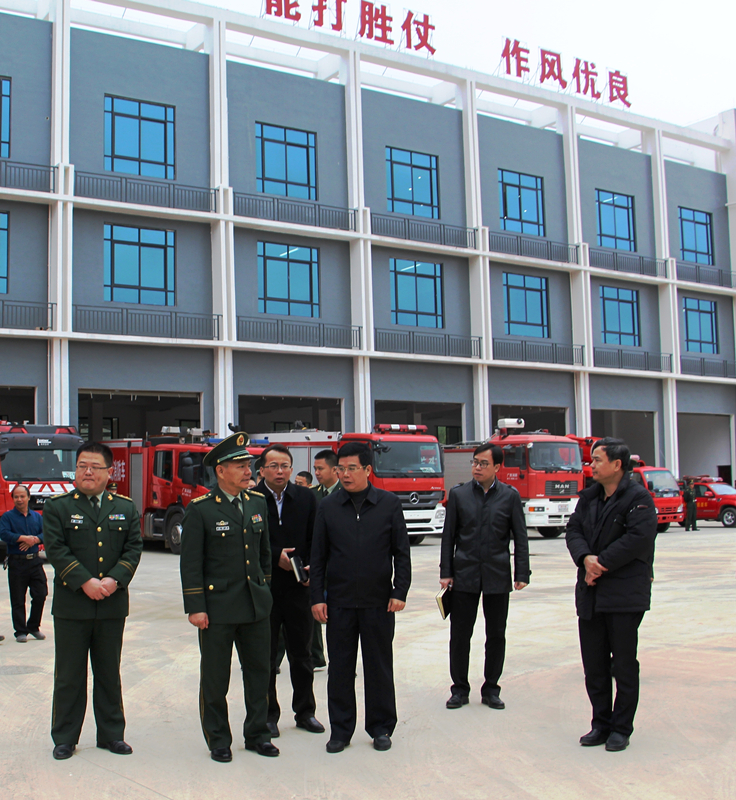 2月23日上午,南寧市消防支隊支隊長鄧錫中在經(jīng)開區(qū)黨工委書記、管委會主任何尚漢、經(jīng)開區(qū)消防大隊大隊長詹寧、綠港集團董事長楊東等領導的陪同下到綠港集團承建的吳圩空港新城消防站開展調研。