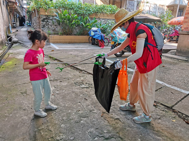 雖然他們年紀(jì)小,但是創(chuàng)城志愿服務(wù)的熱情卻十分高昂。李悅歌小朋友早上一到工作地點(diǎn)就迫不及待地去找工具,一直問媽媽我們能做什么,我們要做什么,甚至連早餐都顧不上吃。一個上午她跟隨著媽媽,對槎路社區(qū)的小廣場進(jìn)行了打掃,清理了球場維修時(shí)打碎的玻璃渣子和積水區(qū)。隨后,她又跟隨著媽媽進(jìn)入到小區(qū)里,撿拾居民丟棄在外面的垃圾。一開始由于個子比較小,拿的夾子有點(diǎn)長,她控制不好,怎么夾都夾不住那個小小的煙頭,經(jīng)過她反復(fù)實(shí)驗(yàn)終于掌握了力道,知道夾子靠下面的部分比較好控制,容易把物品夾起來。在掌握了竅門以后,她開啟了瘋狂“尋寶”的過程。她就像發(fā)現(xiàn)寶藏一樣去發(fā)現(xiàn)丟棄在樹葉、花圃帶、水溝里面的煙頭,甚至比志愿者姐姐和阿姨們發(fā)現(xiàn)的還快,每當(dāng)她撿拾到煙頭,她都特別的興奮。志愿者阿姨們也從草叢里將垃圾撿拾出來,讓她負(fù)責(zé)把煙頭和垃圾放到黑色的垃圾袋里。