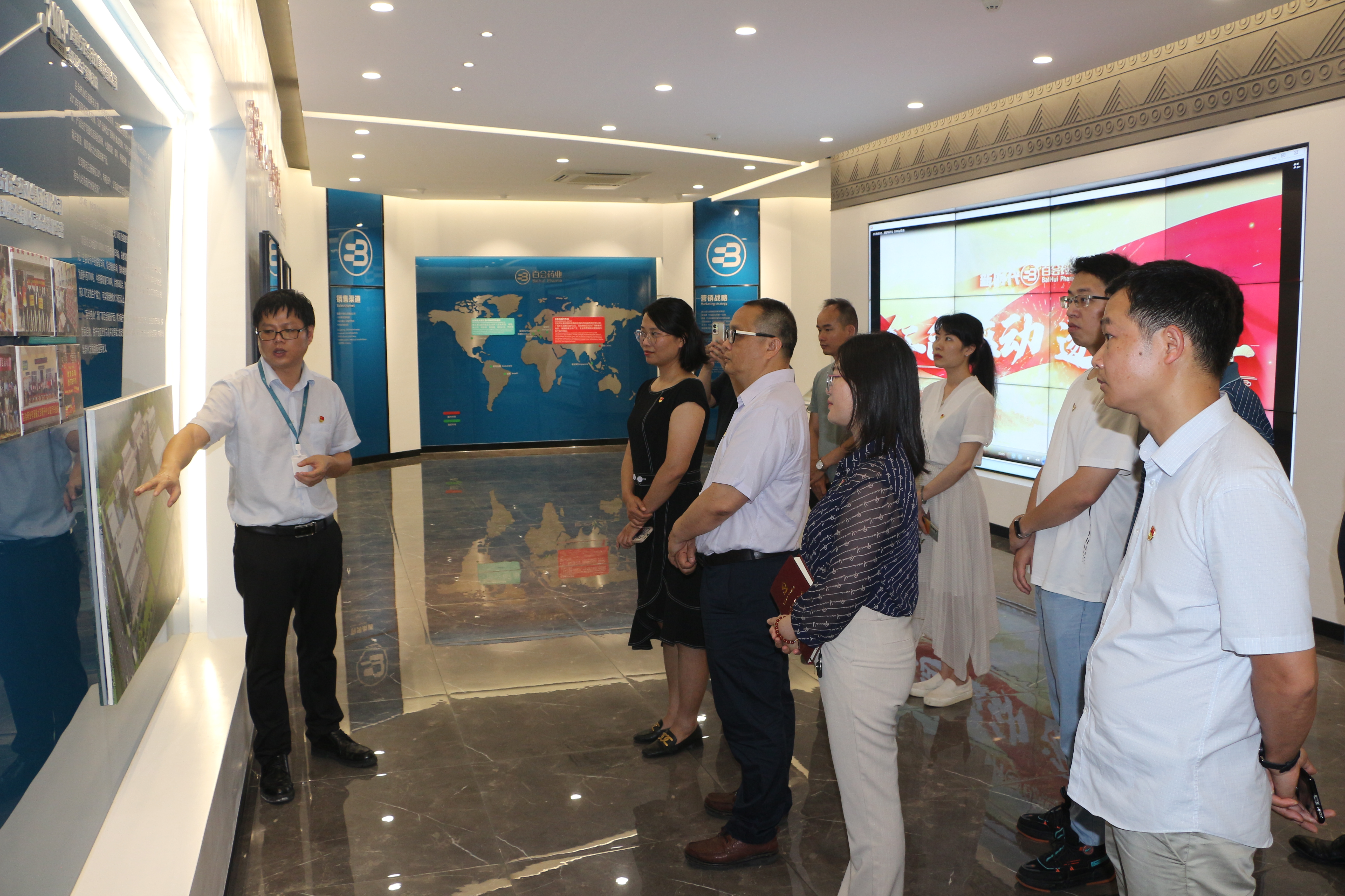 交流活動(dòng)從百會(huì)藥業(yè)的展廳伊始,作為擁有八十年制藥歷史的制藥企業(yè),百會(huì)藥業(yè)黨委堅(jiān)持傳承與發(fā)展,以“思想固基、聯(lián)合會(huì)診、創(chuàng)先爭(zhēng)優(yōu)、人才培養(yǎng)、人文關(guān)懷”五大方面做好黨建品牌創(chuàng)建工作,以黨建引領(lǐng)中醫(yī)藥傳承特別是壯藥在現(xiàn)代醫(yī)學(xué)領(lǐng)域的發(fā)展研究,傳承與發(fā)展的氣息縈繞整個(gè)展廳,參觀人員在游覽中感嘆于百會(huì)藥品技術(shù)發(fā)展與先進(jìn)的制作流程。在藥品展示區(qū),雙方人員提及在支援新冠肺炎疫情防控時(shí)的擔(dān)當(dāng)為民的情況,共贊以職責(zé)擔(dān)使命的行為。